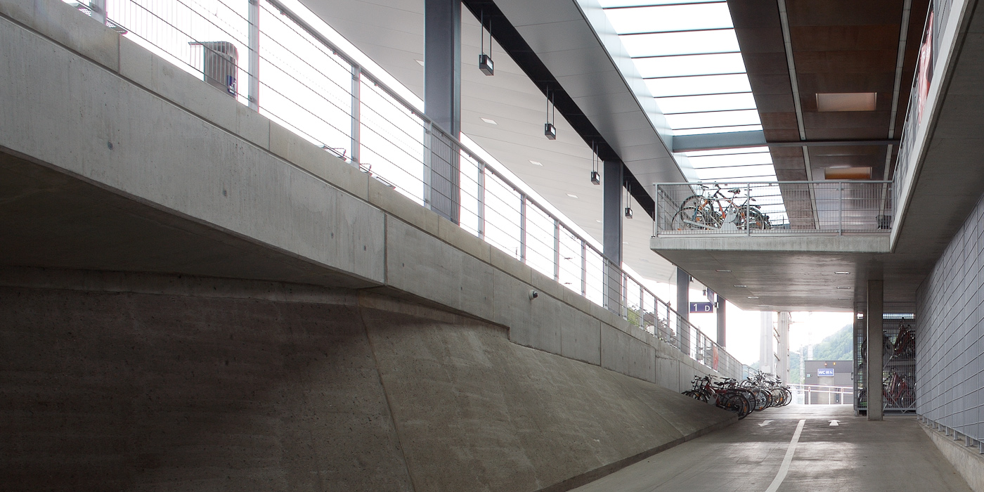 140 Bicycle parking spaces.The Bike Garage is a new, innovative development for a user-friendly parking system: Safe storage in lockable boxes, which are accessible over 24 hours with a chip-card system. The enclosure sits above the bicycle underpass and its architecture is adaptable for different operators, such as for city authorities or privately-owned businesses.