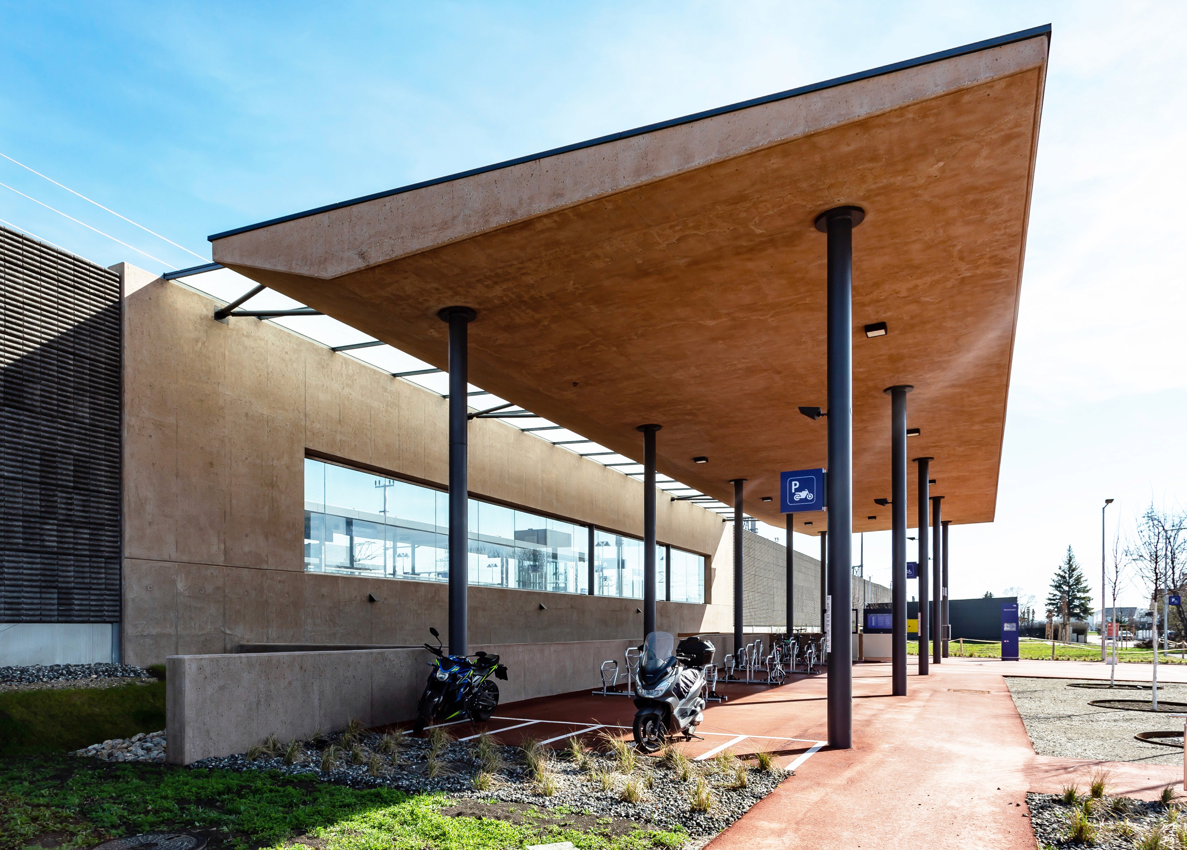 Die Neuerrichtung des barrierefreien Bahnhofs an der Pottendorfer Linie erfolgte in Halbhochlage, mit zwei verglasten Liftanlagen, lichtdurchfluteten Wartebereichen und zwei Inselbahnsteigen mit Überdachung. Sichtbeton, der mit roten und gelben Farbpigmenten versetzt ist, schafft einen kompakten Baukörper, der sich im Bahnsteigbereich mit breiten Fensterbändern und Sichtachsen öffnet. An beiden Seiten des Bahnhofs befinden sich eine überdachte Bike&Ride-Anlage und eine Park&Ride-Anlage.