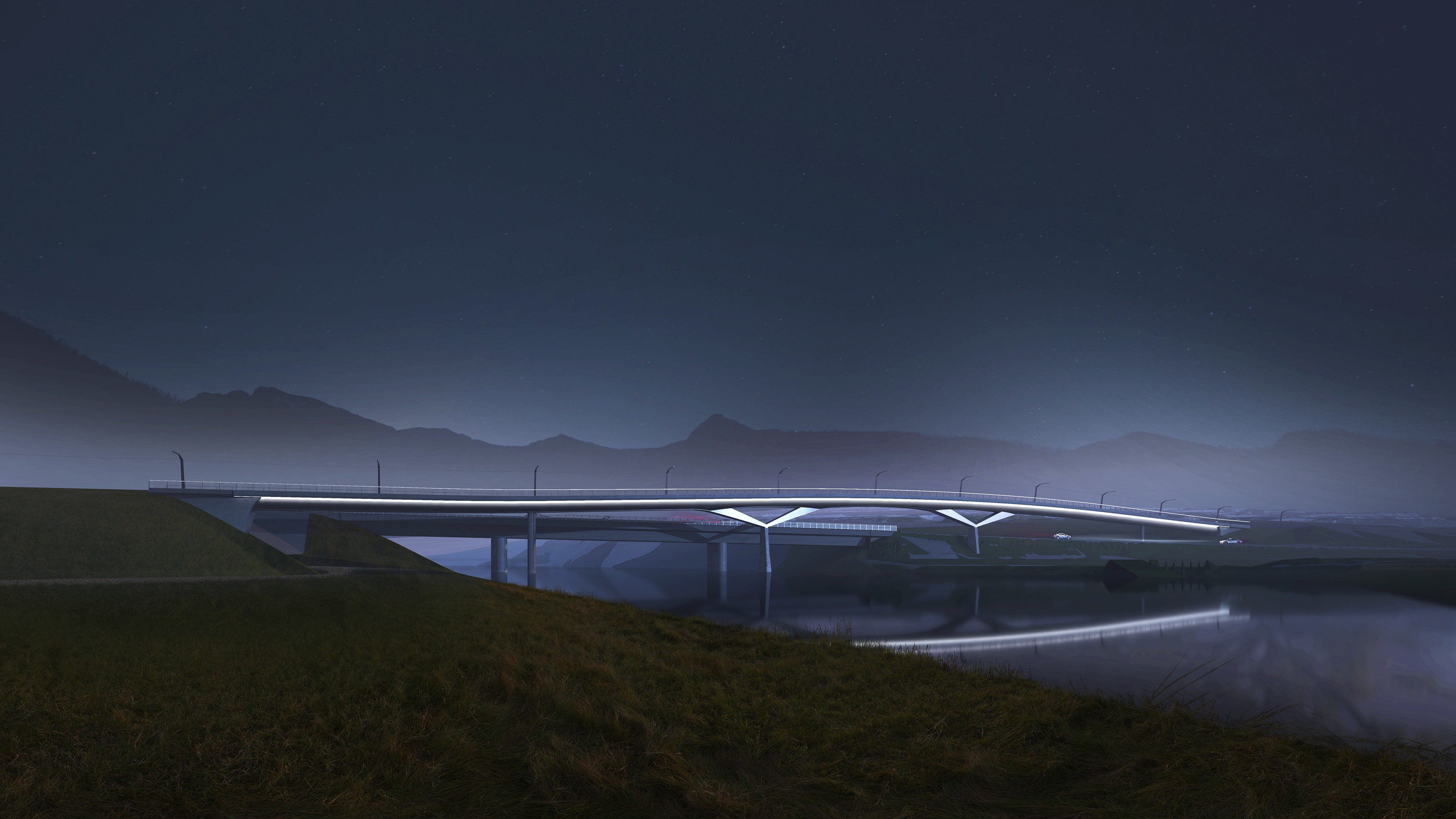 Ein Brücken-Paar als Stadtbaustein für eine nachhaltige Mobilitätsentwicklung - quer durch Innsbruck und Umgebung mit der Straßenbahn. Das Konzept thematisiert die Konstruktion von zwei neuen Brücken als Elemente der Stadtentwicklung Innsbrucks, zur Realisierung eines durchgehenden Straßenbahnnetzes von Rum bis Völs und überspannt einen Bundesstraßen-Kreisverkehr und zwei Uferseiten des Inn. Das Tragwerk der Brücken wird mit minimalen Gesten aus Funktion, Position und umgebender städtebaulicher und topographischer Struktur abgeleitet. Die Stadt ist hier nicht zu Ende und sie fängt auch nicht hier an; die Brücken markieren jeweils Übergänge eines sich ausdehnenden Stadtkörpers.